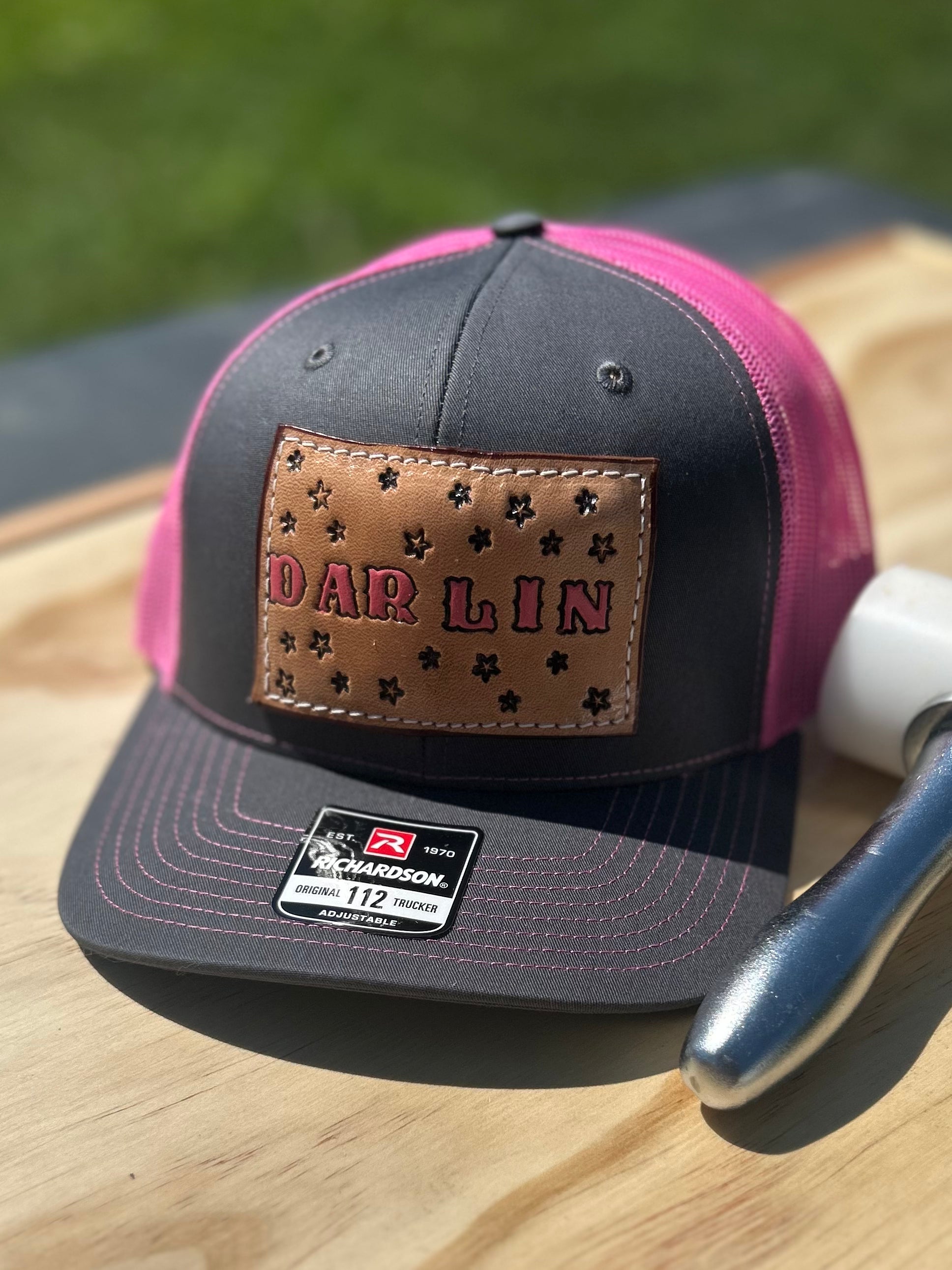 DARLIN' heather grey/neon pink Richardson 112 trucker hat with leather tooled patch. Leather is made from 5-6 oz Herman Oak Leather.