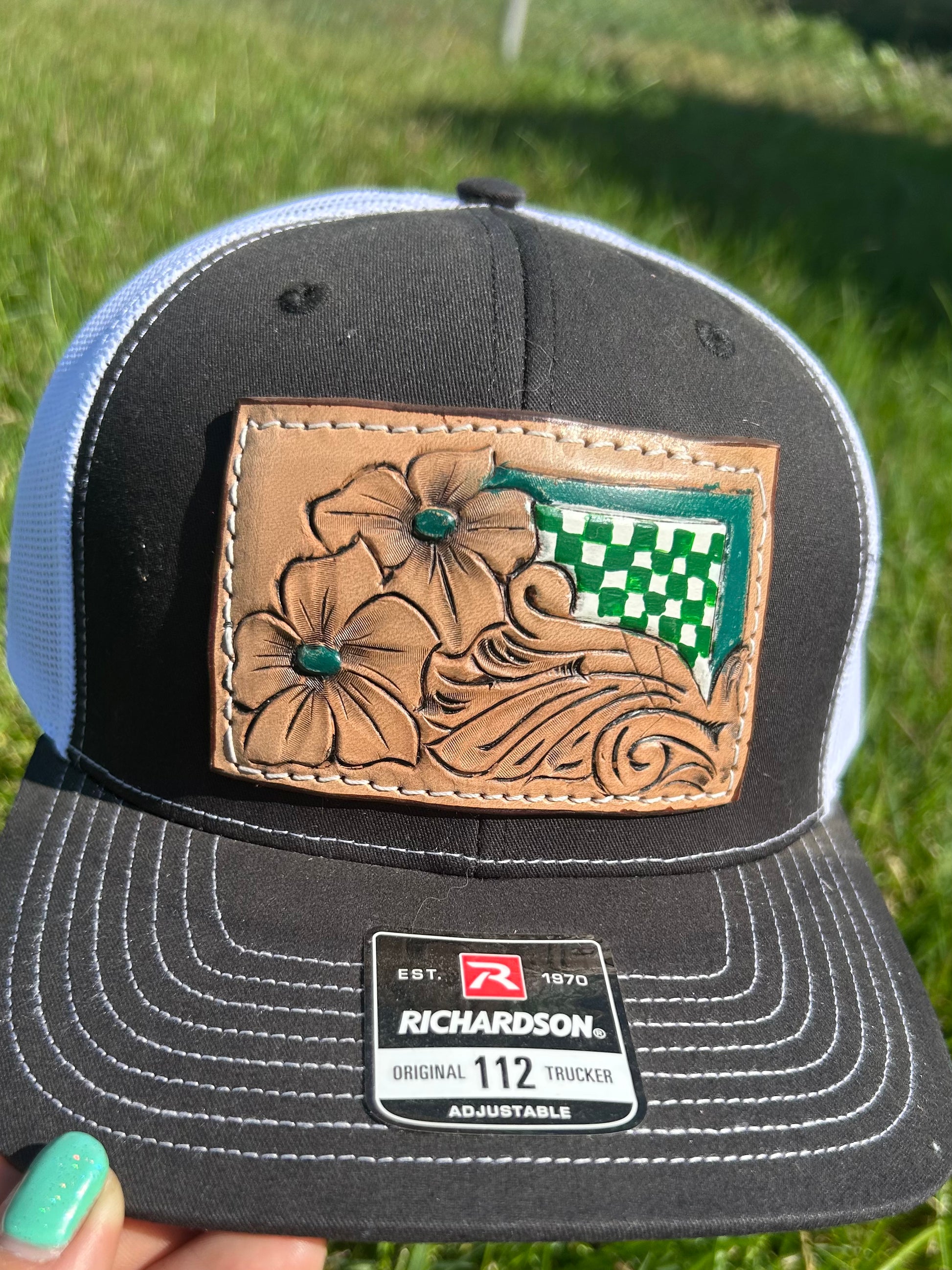 'Green Checkered' Richardson 112 trucker hat with leather tooled patch. Leather is made from 5-6 oz Herman Oak Leather.