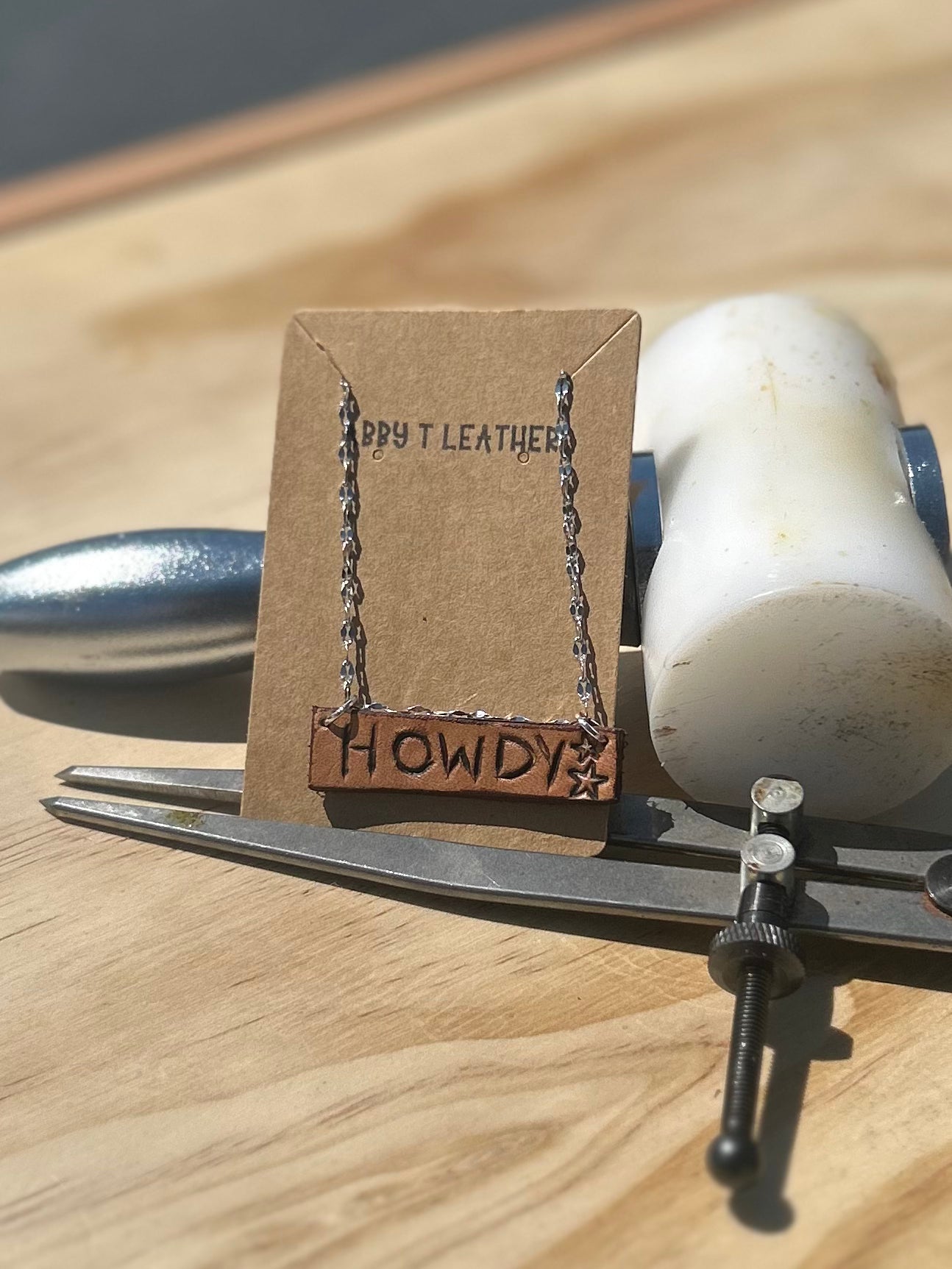 Herman Oak leather(1 inch X 2 inch), stainless steel chain(17 inch).