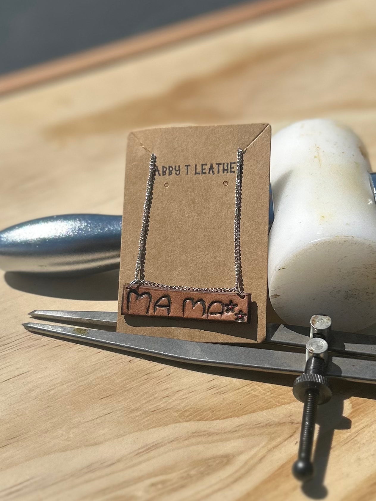 Herman Oak leather(1 inch X 2 inch), stainless steel chain(17 inch).