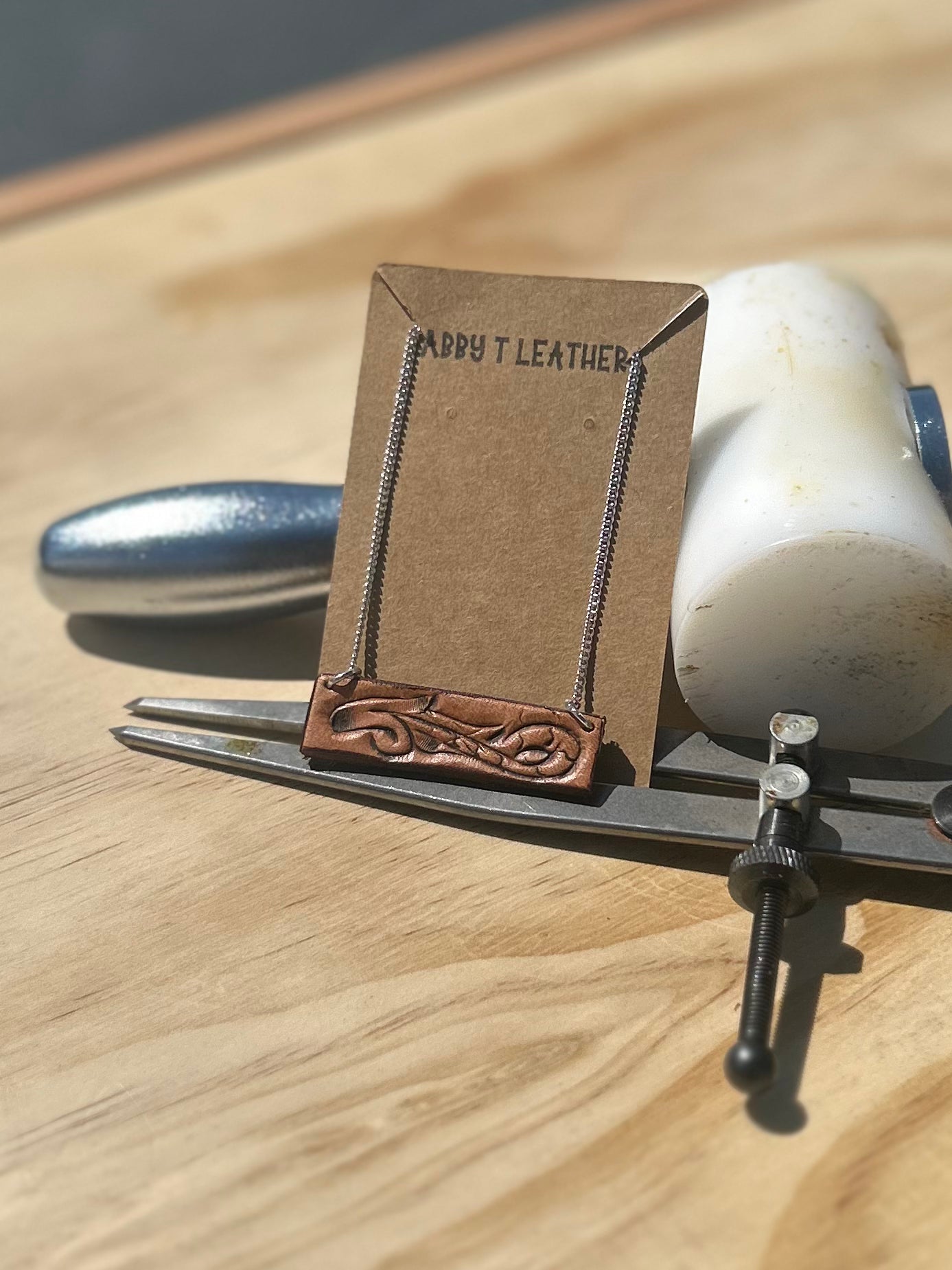 Herman Oak leather(1 inch X 2 inch), stainless steel chain(17 inch).