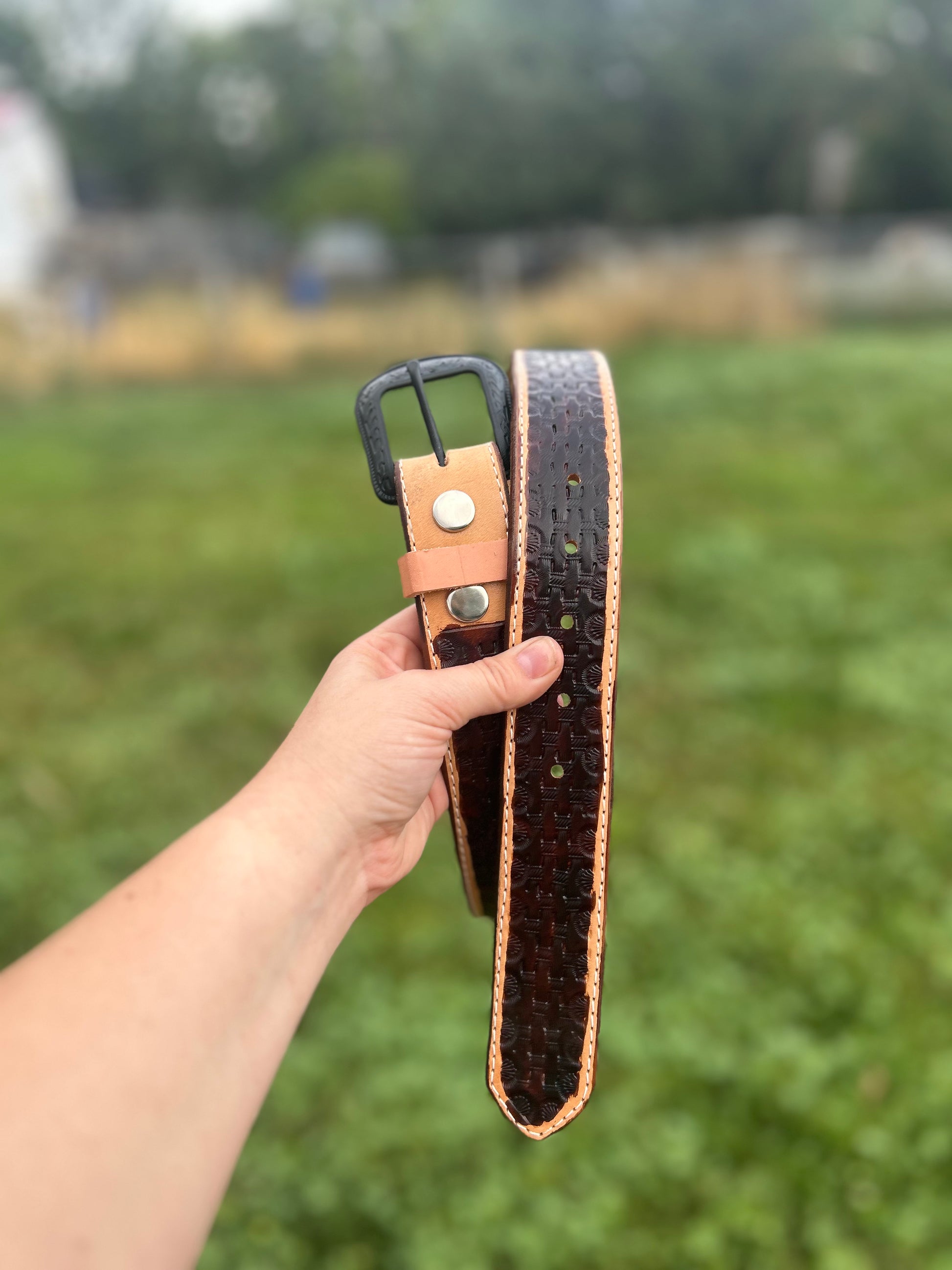 Herman Oak leather, turquoise suede with gunslinger stitch pattern.